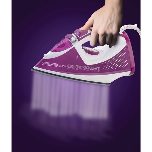 Powerful 2400W steam iron with ceramic soleplate, continuous steam, and convenient features for easy ironing.