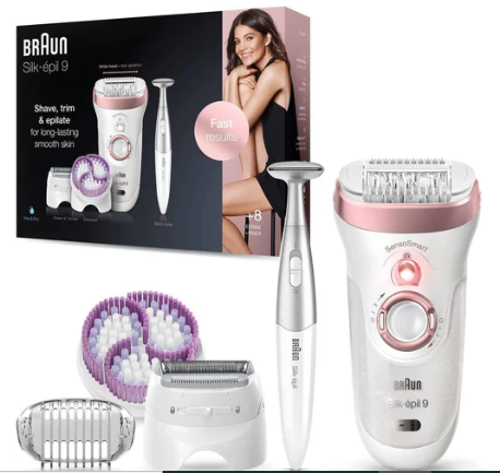 The world’s first smart epilator with new SensoSmart technology offers gentle hair removal with reduced pressure. This cordless wet & dry epilator can be used in the bath or shower, and includes 2 body exfoliation brushes to prevent ingrown hairs. It comes with 8 extras, including a facial cap, skin contact cap, shaver and trimmer cap, and a bikini trimmer for sensitive areas. Enjoy the convenience and effectiveness of this Braun epilator.