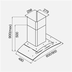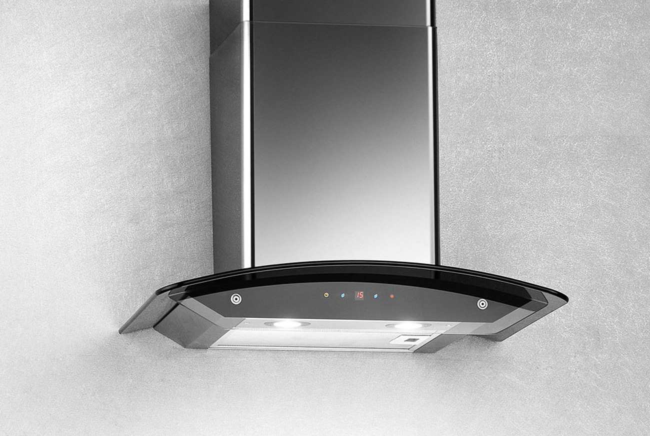 Model K560TSL 60cm Glass Chimney with 760m3/hr air flow, sensor touch LED control, 4 speeds, timer, carbon & aluminum filters, 2x1W LED lights, extraction & recirculation.