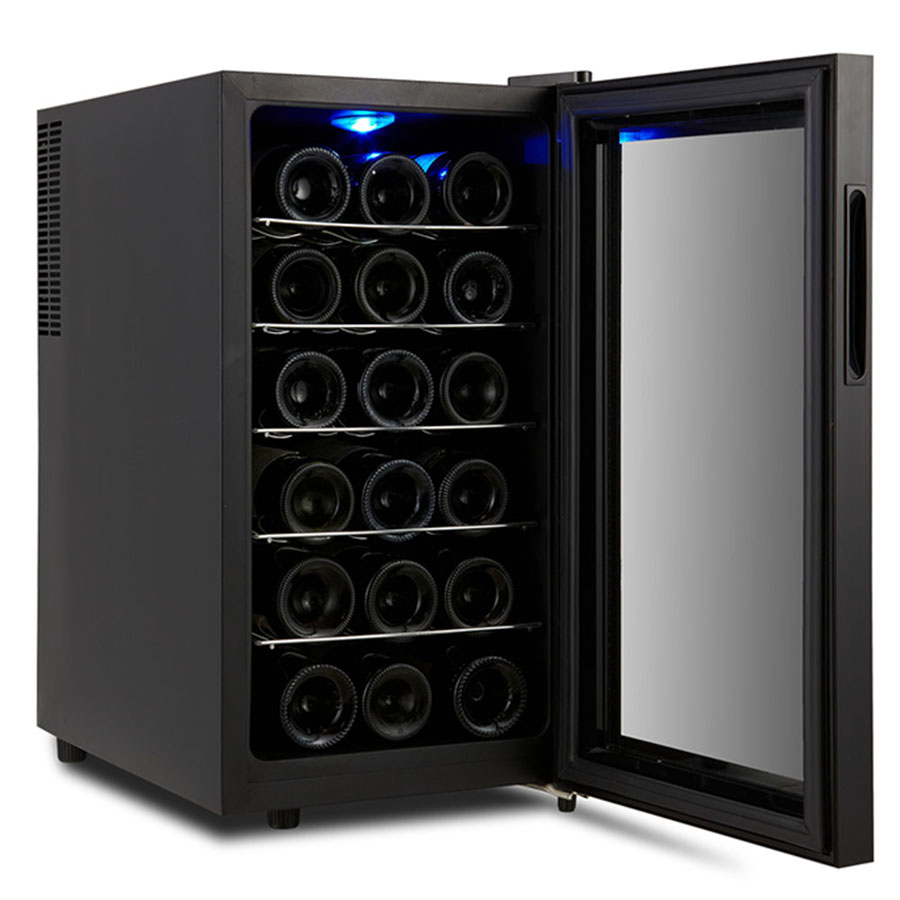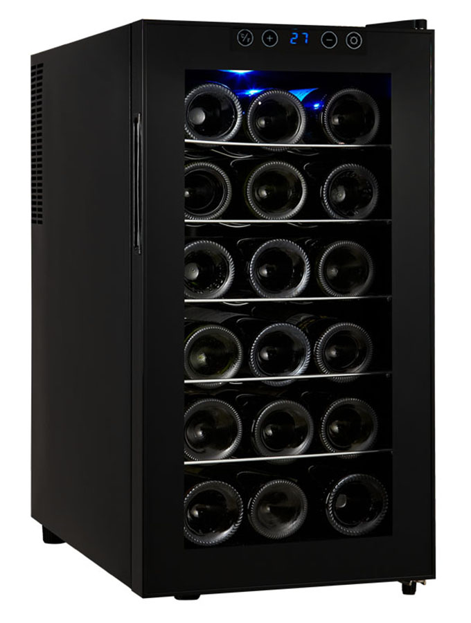 Sleek black countertop wine fridge with glass front, 18-bottle capacity, thermoelectric cooling, LED display, and interior LED light.