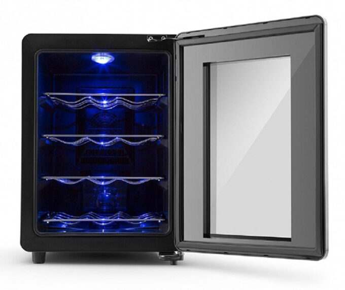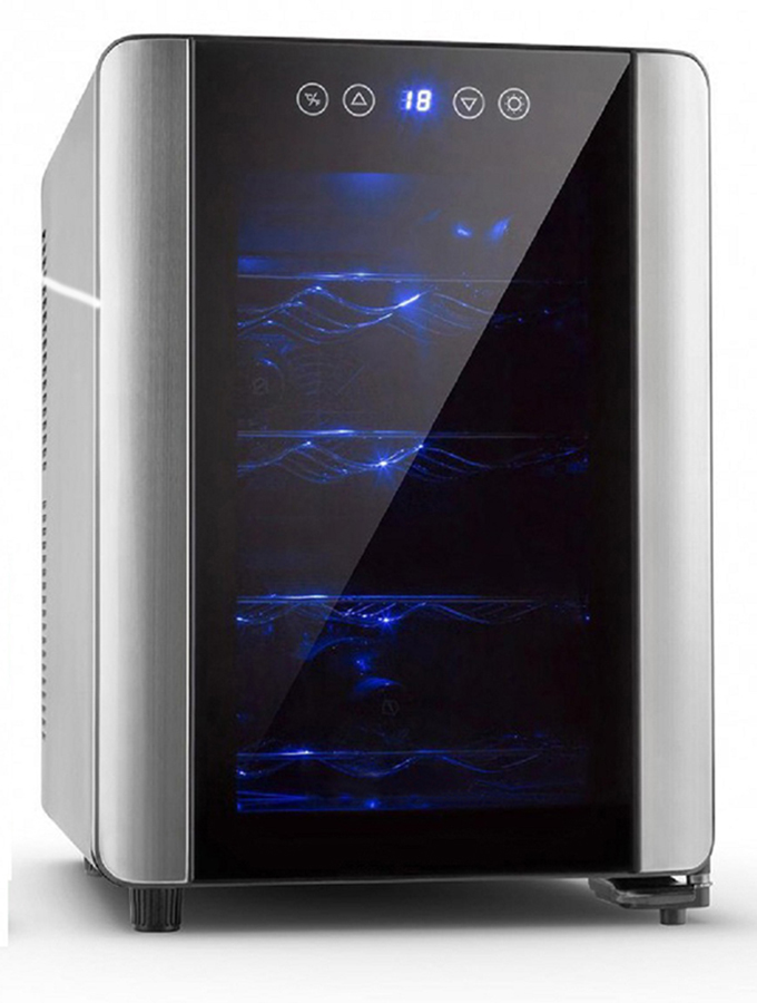 Stylish black wine cooler with 12-bottle capacity, thermoelectric cooling, LED display, and interior light. External touch control and sleek design. 1-year warranty.