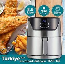 Powerful XYZ Air Fryer with digital display, 8.5L capacity, hot air circulation. Features adjustable temperature, auto power off, and stainless steel parts. Inox body material for durability. 3-year warranty.