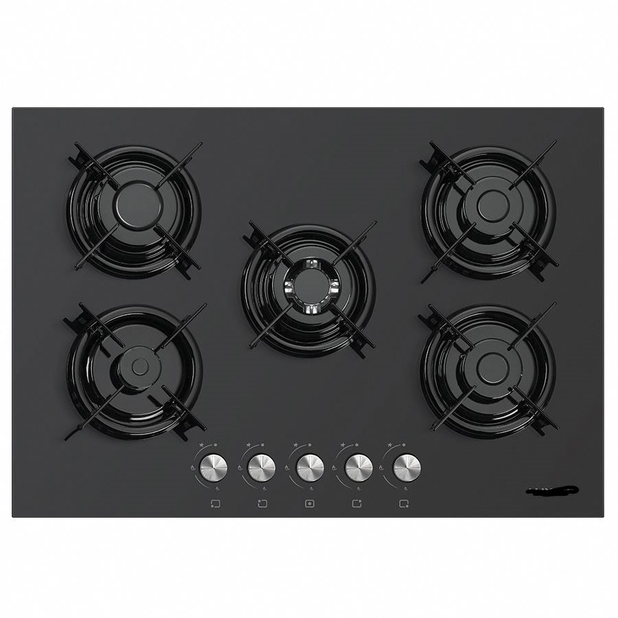 The product features a sleek black glass surface with 5 compartments including 1 turbo burner. It comes with enamel grill, automatic lighter, and enameled burner covers. Convertible for natural gas to LPG with a 3-year warranty.