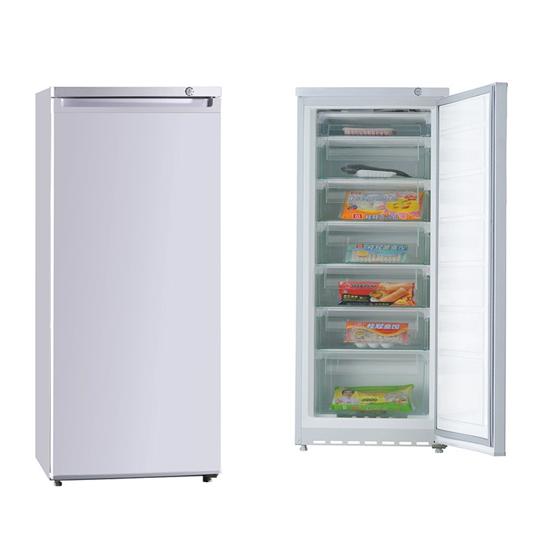 Spacious and energy-efficient upright freezer with mechanical control, 198L capacity, 7 drawers, and stylish white/stainless steel design. Includes 1-year warranty.