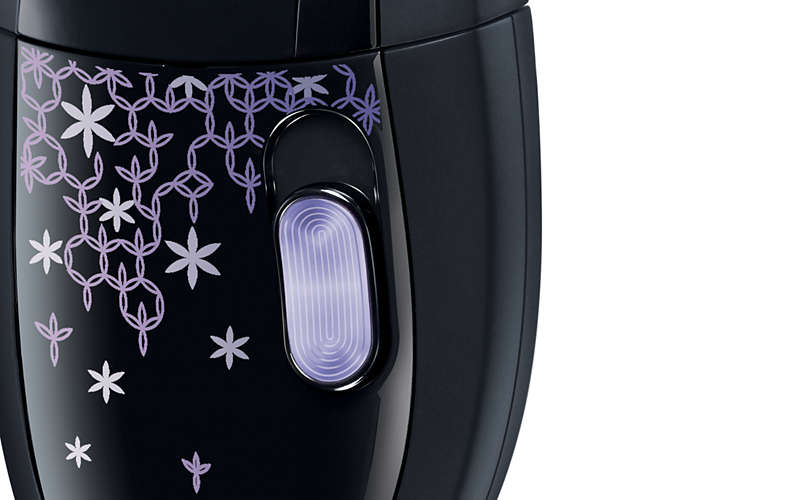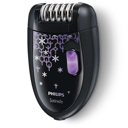 Corded epilator with ergonomic handle for easy leg epilation. Features gentle tweezing discs, 2 speed settings, and efficient epilation system.