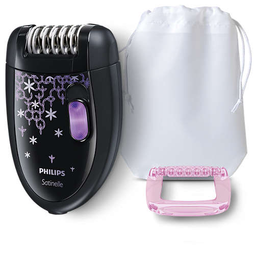 The corded epilator with ergonomic handle makes leg epilation easy. Comes with 2 accessories for efficient hair removal. Features gentle tweezing discs, 2 speed settings, and an efficient epilation system. Includes a cleaning brush, efficiency cap, massage element, and a basic pouch. Washable epilation head and 13V voltage. Backed by a 2-year guarantee.