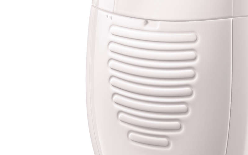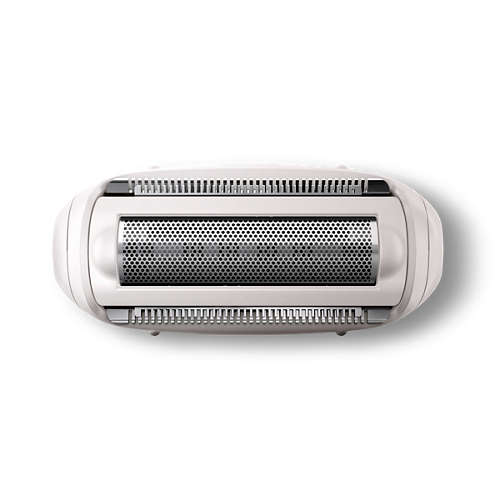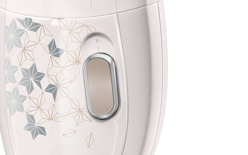 Corded epilator for legs with ergonomic handle, gentle tweezing discs, washable head. Includes 3 accessories: shaving head, trimming comb, cleaning brush.