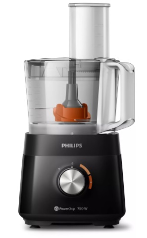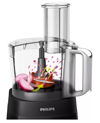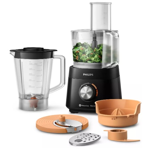 Powerful PHILIPS Food Processor with 2 speeds, 1.5L capacity, 750W, 220V, and 6 accessories. Black plastic body and jar. 1-year warranty included.