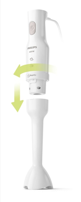 PHILIPS ProMix Hand blender HR2520/01: Powerful 400W motor, ProMix Technology, special bar cage, ergonomic grip, easy-to-use button, lightweight design in white color. Compact dimensions, 1.2m cord, 1-year warranty.