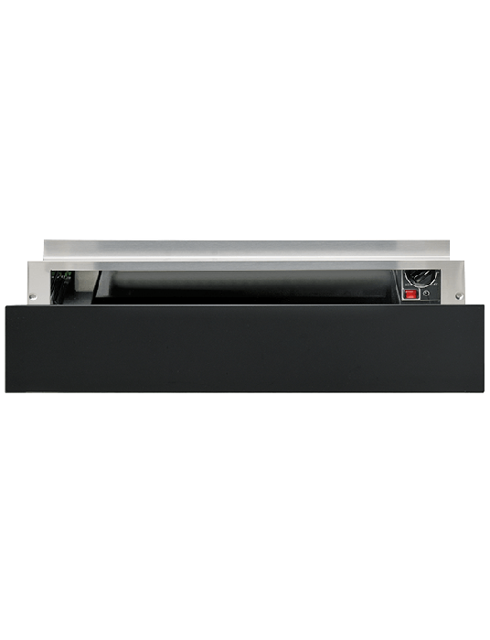 Sleek warming drawer with black glass panel, 22L capacity, and precise temperature control. Integrates seamlessly, durable stainless steel cavity, backed by a one-year warranty.